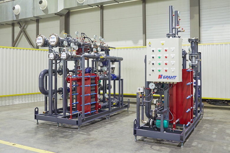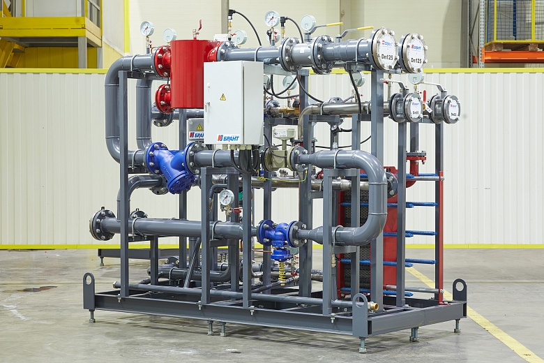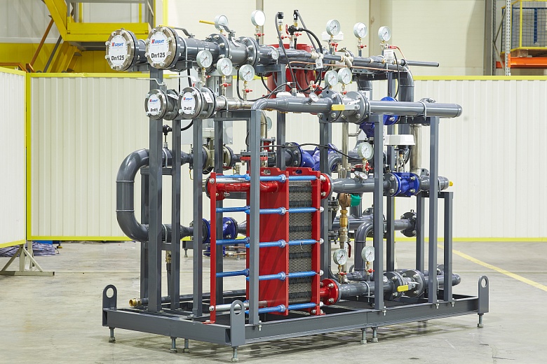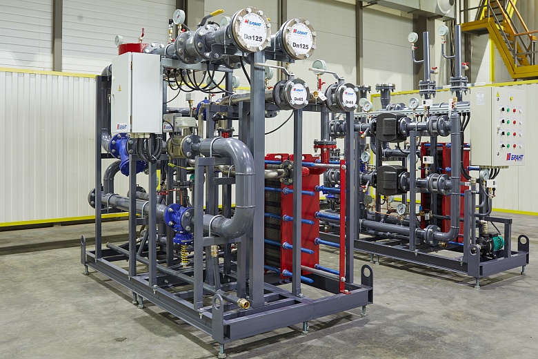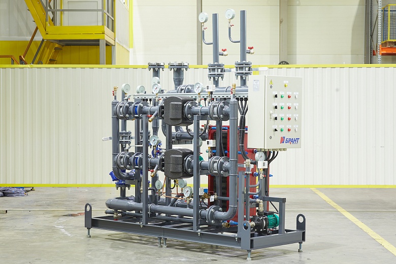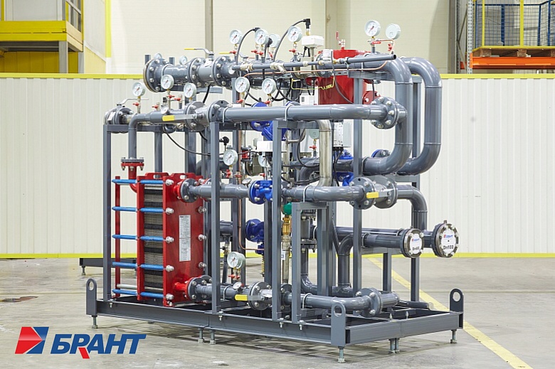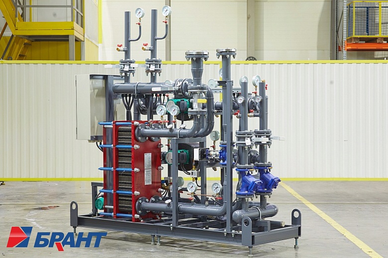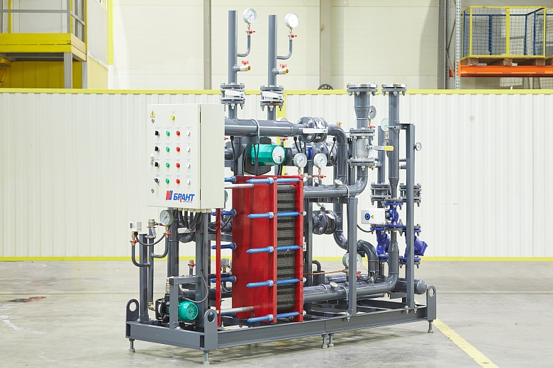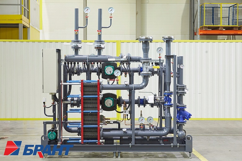 Для возможности размещения нового теплового пункта в ограниченном пространстве существующего помещения специалисты компании разработали нестандартную компоновку оборудования, объединив на единой раме блок ввода и ГВС.